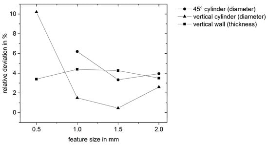 Features smaller than 0.5 mm are not converted into scanning vectors in the slicing software Materialise Trumpf Build Processor and Magics 24.1 due to the set-up beam compensation of 100 µm in combination with the beam diameter of 200 µm. Therefore, the smallest features of the benchmark geometry with thicknesses of 100 µm were not scanned and could therefore not be analyzed. The geometrical accuracy was highest for vertical cylinders larger or equal to 1 mm in diameter (see Figure 9). The increased relative deviation at a diameter of 500 µm is attributed to the large laser focus and beam compensation. For vertical walls, the deviation was feature size independent around 3 to 4%. Overall, features larger than 500 µm had a very high accuracy.