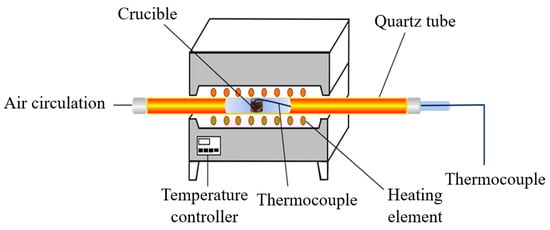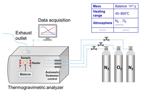 The fixed bed system and TGA analyzer in this experiment are shown in Figure 1 and Figure 2, respectively. The fixed bed instrument is used to obtain the mixtures heated in the N2/O2 atmosphere for thermal aging, which can be heated to the desirable temperature and remain for a fixed time, set through judgement. The mixtures are put into a heat-resistant glass bottle and lean towards the inner edge of crucible in the fixed bed. This confirms the process of heating steadily and uniformly. The thermal aging experiment is carried out by the automatic heating system with controlled time. The set temperature of thermal aging process is 5 °C higher than the desirable temperature to offset the heat losses of the gas flow.