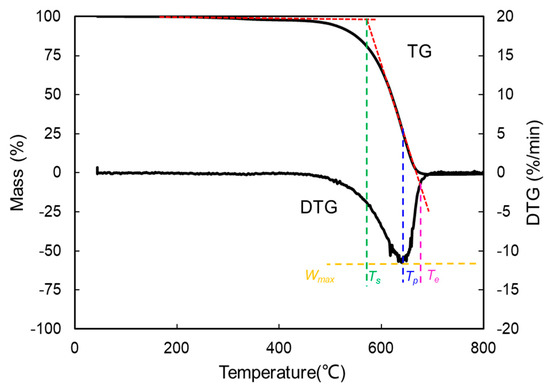With the increasing temperature, TG curves are achieved by recording the mass loss of the mixture continually, and the derivative thermogravimetric (DTG) curves are obtained by differentiating the TG curves. The starting temperature (Ts), ending temperature (Te), and peak temperature (Tp) are extracted to evaluate the oxidation performance [33] as identified in Figure 3.