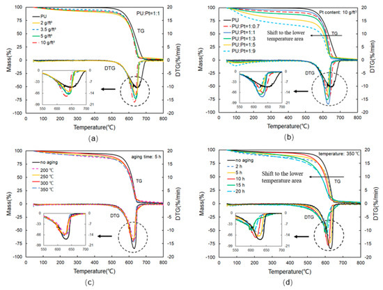 TG-DTG curves in different experiments: (a) different Pt contents of PU/catalyst mixtures; (b) different ratio of PU/Pt mixtures; (c) different thermal aging temperatures; (d) different thermal aging times.