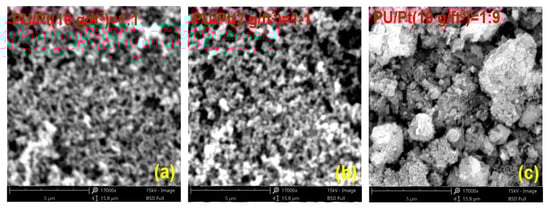 SEM diagrams in no aging experiments: (a) PU/Pt (10 g/ft3) = 1:1; (b) PU/Pt (2 g/ft3) = 1:1; (c) PU/Pt (10 g/ft3) = 1:9.