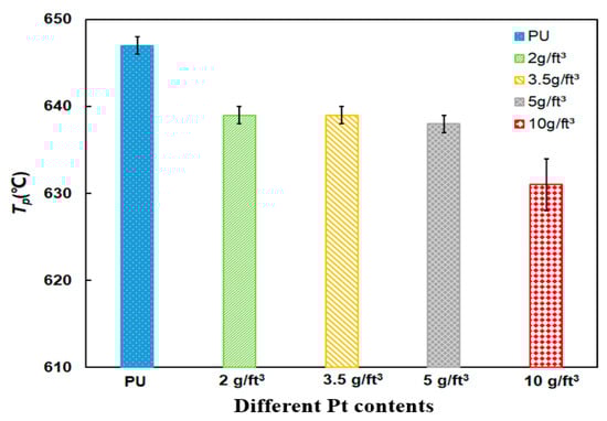 The peak temperature is another objective index which represents the maximum weight loss rate. Compared to the Tp of PU particles at 647 °C, the Tp of 10 g/ft3 Pt content of PU/Pt mixture is 632 °C from Figure 7, which reduces 15 °C. The main reason can be explained that the larger Pt content mixture is more likely to form the higher vacancy concentrations and facile oxygen desorption, which is beneficial for PU particles to be oxidized earlier and rapidly [36]. The 10 g/ft3 Pt content of catalyst are applied in the subsequent experiments.