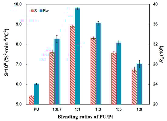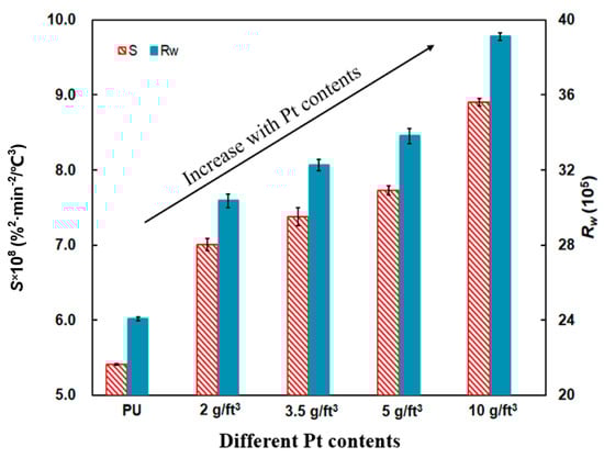 This may be explained that the PtO2 particles and large Pt microcrystals can be formed and reduced easily with the increase in the amount of Pt catalyst. In the process of reduction, the oxygen atoms adsorbed on the surface can be generated in a quick and easy way [20,36,43]. With those oxygen atoms, the PU/Pt mixtures in proper ratios below 1:1 can carry out more oxygen atoms to improve the oxidation performance. However, when the weight ratios are beyond 1:1, the uniformity of mixtures is not so superior, and too many Pt catalysts may block the contact area between the PU particles and oxygen. The oxygen atoms adsorbed on the surface of the PU particles may finally show a saturated tendency [38,43]. The contact area reduces because of the reduced oxygen adsorption capacity and the blockage of the Pt catalyst [42,44], which negatively affects the increase in the S and Rw indices obviously. As a result, the PU/Pt mixture at 1:1 is applied in the next experiments.