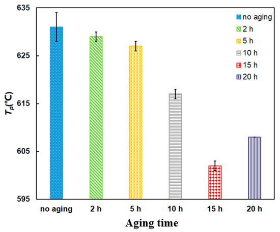 A comparison of the Tp is shown in Figure 13. The Tp fluctuates below 635 °C and all the Tp of aging mixtures are lower than that of the no aging mixture, which indicates that the aging mixtures can improve the soot ignition performance. When the aging time is 15 h, the value of Tp reaches the minimum point at 602 °C, which reduces by 29 °C. This may be explained that the Pt catalyst after thermal aging process has the better low-temperature area reduction performance than the no aging mixture [36,43]. This indicates the Pt atoms can be oxidized to different forms of Pt oxides, such as PtO, PtO2 and PtO2 [45], during the thermal aging process. The Pt oxides’ reduction can release the oxygen atoms, which decreases the Tp of PU particles during the regeneration process.