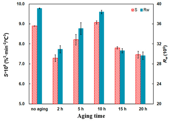 - When the aging time is from 2 to 20 h at 350 °C, the tendency of shifting to the lower temperature area is more obvious. When the aging time is 10 h, the S and Rw indices reach the maximum values at 9.07 × 10−8 %2min−2°C−3 and 38.39 × 105, respectively.