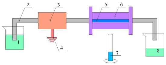 The MnSO4·H2O solution at a concentration of 0.4 mol/L and KMnO4 solution at a concentration of 0.1 mol/L were prepared in a digital control ultrasonic cleaner (model: KQ-100DB, supplier: Kunshan ultrasonic instruments Co., LTD, Kunshan, China) at a power of 100 W, a frequency of 40 KHz, and a temperature of 25 °C for 10 min. The MnSO4·H2O solution was injected into the PTFE hollow fiber membrane using a syringe, and then the PTFE hollow fiber membrane was dried at a temperature of 75 °C for 12 h. After cooling to room temperature, the KMnO4 solution was injected into the PTFE hollow fiber membrane using a syringe, and then the hollow fiber membrane was treated by ultrasonic vibration at a power of 100 W, a frequency of 40 KHz, and a temperature of 25 °C for 1 h. This was done so that the KMnO4 solution could enter into the micropores of the hollow fiber membrane, and come into adequate contact and produce a complete reaction with MnSO4. Thereafter, the PTFE hollow fiber membrane was dried at a temperature of 75 °C for 24 h. Finally, the MnO2/PTFE hollow fiber membrane was obtained. The residual MnO2 particles in the hollow fiber were washed away using deionized water at a flow rate of 500 mL/h provided by a peristaltic pump, which is shown in Figure 1.