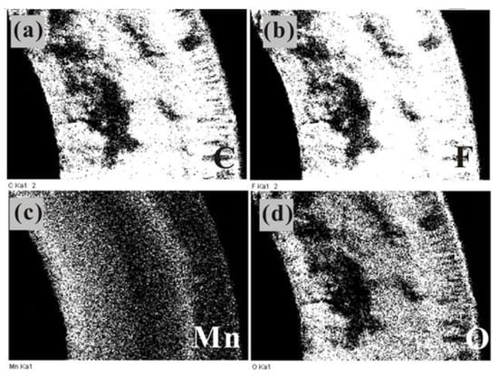 The distribution of manganese oxides in the membrane pores was observed using element distribution analysis. The distribution of C, F, O, and Mn in the cross-section of the manganese oxide/PTFE hollow fiber membrane was obtained using mapping.