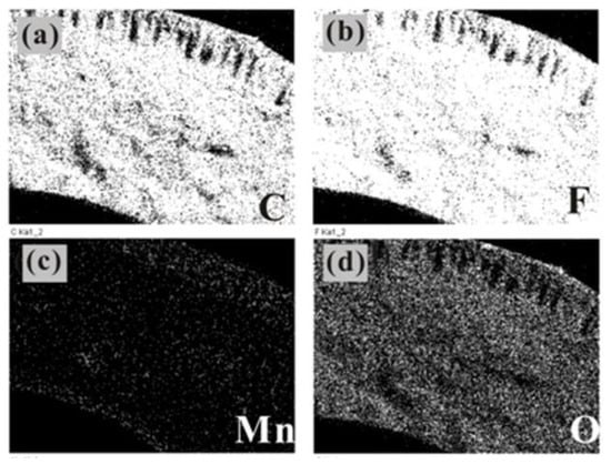 Mapping image of the Mn3O4/PTFE HFM of: (a) C element; (b) F element; (c) Mn element; (d) O element.