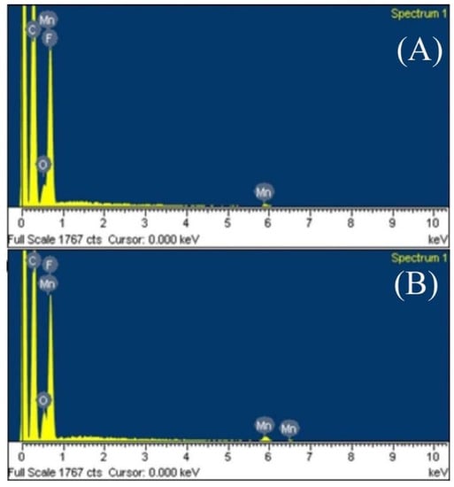 EDS spectrum image of: (A) MnO2/PTFE HFM; (B) Mn3O4/PTFE HFM.