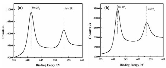 In order to determine the valence state of Mn in the manganese oxide/PTFE hollow fiber membrane, the manganese oxide/PTFE hollow fiber membranes were analyzed using X-ray photoelectron spectroscopy (XPS), and the oxidation state was determined from the position of the Mn2P binding energy, as shown in Figure 6.
