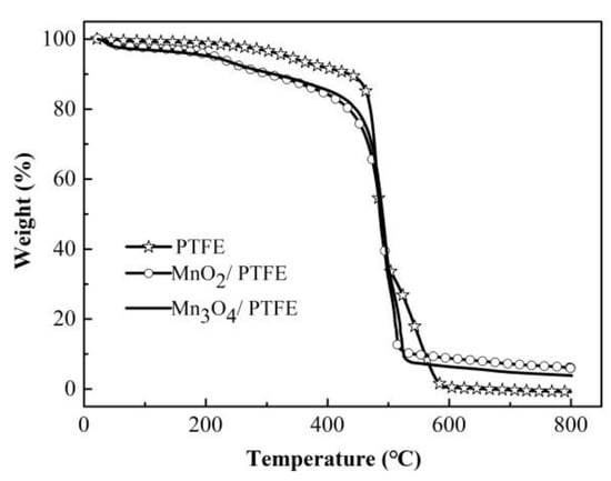 TG analysis of PTFE, MnO2/PTFE, and Mn3O4/PTFE HFMs.