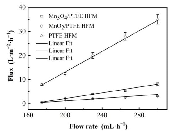 On the other hand, the fluxes of the PTFE hollow fiber membranes were much higher than that of the others at 7.9, 12.5, 20, 28, and 35 L/m2/h corresponding to the flow rates of 175, 200, 230, 265, and 300 mL/h, respectively. The fluxes of the MnO2/PTFE hollow fiber membrane were the smallest at 0.43, 1.54, 2, 2.59, and 3.16 L/m2/h at the same inlet flow rates. The flux of the Mn3O4/PTFE hollow fiber membrane was almost twice that of the MnO2/PTFE hollow fiber membrane. The reason for the flux decrease could be the occupation of manganese oxide in the pores of the PTFE hollow fiber membrane. Moreover, the content of MnO2 was about 25% higher than the content of Mn3O4 in the PTFE hollow fiber membrane, which can be observed in Figure 7 and Table 3.