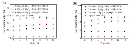 It is clear to see that the degradation performance was much higher when manganese oxide was loaded in the PTFE hollow fiber membrane, and the increase in H2O2 concentration led to a higher degradation rate. When the H2O2 concentration was 0.03 mol/L, the phenol degradation efficiencies of the MnO2/PTFE and Mn3O4/PTFE hollow fiber membranes were 50% and 35% after 14 h. From the mechanism, it can be inferred that the surface of MnO2 was rich in Mn3+ and Mn4+ [29], while Mn3O4 was composed of Mn2+ and Mn3+. This ion distribution produced MnO2 and Mn3O4 in the pores of the PTFE hollow fiber membrane and thus a strong catalytic reaction [30]. This catalyzed H2O2 to produce a large amount of substances that degrade phenol.