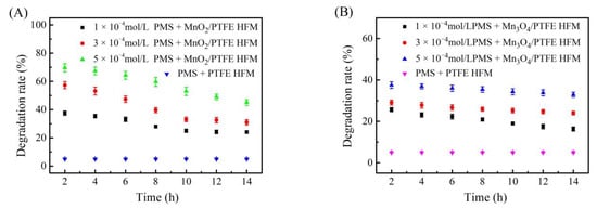 The degradation performance was much higher when manganese oxide was loaded in the PTFE hollow fiber membrane, and the increase in PMS concentration resulted in a higher degradation rate.
