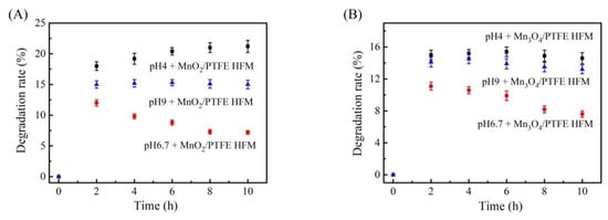 It was found that in the weak acid environment, the degradation of phenol by the two kinds of the manganese oxide/PTFE hollow fiber membrane was higher (as shown in Figure 11). This may be related to the strong capacity of oxygen storage of manganese oxide. Manganese oxide catalyzes oxygen to produce oxygen anion [34,35,36], while H+ promotes the degradation of organic matter. In the weak alkali environment, the decrease in phenol was relatively stable. This was hypothesized to be due to the weak acidity of phenol, which can partly react with sodium hydroxide.