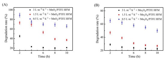When the membrane flux was 0.5 L/m2/h, the phenol degradation rate of the MnO2/PTFE and Mn3O4/PTFE hollow fiber membranes reached 90% and 80%, respectively. When the flux was 1.5 L/m2/h, the membrane still demonstrated obvious phenol removal in a short time, but with the increase in time, the phenol degradation effect decreased. However, when the flux was 3 L/m2/h, the removal efficiency of phenol was not obvious (as shown in Figure 12). This reveals that it would take a certain reaction time for manganese oxide to catalyze PMS to produce free radicals. The smaller the flux, the more the free radicals that were produced by the manganese oxide to catalyze PMS. A longer reaction time between the organic matter and free radicals would produce an improved reaction.