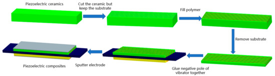 The 2-2 piezoelectric composite trilaminar vibrator comprised a piezoelectric phase, a polymer phase, and surface electrodes with the following structural parameters: length = 50 mm, width = 14.8 mm, height = 2 mm, column width = 2 mm and joint-cutting width = 0.56 mm. The PZT-5A piezoelectric ceramics, silicone rubber and silver paste are selected as the piezoelectric phase, polymer phase and surface electrode, respectively. The 2-2 piezoelectric composites are prepared by the “dice-filled” method [