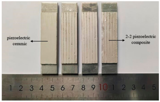 The 2-2 piezoelectric composite material is selected to prepare the trilaminar vibrator according to the results of finite element simulation. Three groups of the trilaminar vibrators are prepared in this experiment to ensure the accuracy of the experiment. Each group has two samples of different materials, including a 2-2 piezoelectric composite trilaminar vibrator and a piezoelectric ceramic trilaminar vibrator, and the total number of samples is six. The 2-2 piezoelectric composite trilaminar vibrator is used to study the bending vibration characteristics of the novel piezoelectric composite vibrator, while the piezoelectric ceramic trilaminar vibrator is used for comparative experiments.