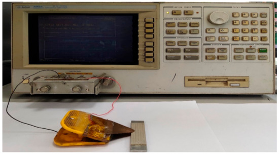 Figure 10, and the high voltage terminal H and low voltage terminal L are connected to the upper and lower surfaces of the trilaminar vibrator, respectively. Such an impedance analyzer adopts the technology of automatic balance bridge and measures based on Ohm’s law. The impedance, bandwidth and electromechanical coupling coefficient of the vibrator are calculated by adding an AC source on the surface of the trilaminar vibrator. These parameters can be automatically read in the computer through the external display. The resonant frequency and bandwidth of the vibrators are directly measured. Meanwhile, the effective electromechanical coupling coefficients are calculated using Equation (1), where