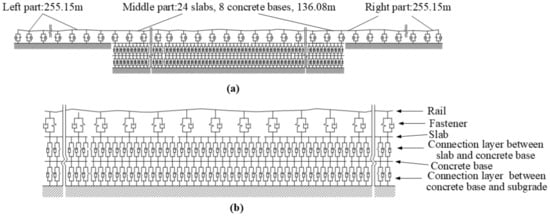In recent years, high speed railways have been widely used around the world due to their outstanding advantages, such as their large capacity, comfort, punctuality, safety, and environmental friendliness. However, due to the dynamic impacts of high-speed trains, maintenance work for traditional ballasted tracks is difficult, and accompanied by a large consumption of labor and economic resources. To reduce maintenance work, ballastless track structures are widely used in high speed railway lines. Apart from the conventional ballastless track widely used in high speed railway, vibration-reduction ballastless tracks [] are applied to places where a reduction in vibrations transmitted from high speed railways into the surrounding soil and nearby buildings is highly demanded.