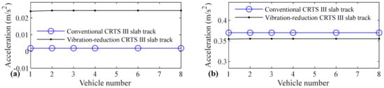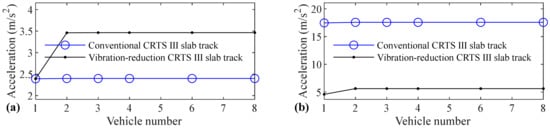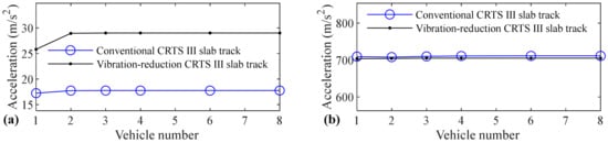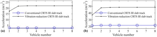 The rail acceleration has some relation with the vehicle number for the vibration-reduction CRTS III slab track without track irregularity, as shown in Figure 6. When the vehicle number increases from one to two, the rail acceleration increases by 12.1%. From Figure 6, we can further see that the rail acceleration has little relation with the vehicle number for the conventional CRTS III slab track without track irregularity, the conventional and vibration-reduction CRTS III slab tracks with random track irregularity, and the rail acceleration increases by 2.9%, −0.2%, and 0.1%, respectively, when the vehicle number increases from one to two. To research the rail acceleration, only one vehicle is needed for the conventional CRTS III slab tracks without track irregularity and with random track irregularity, and the vibration-reduction CRTS III slab track with random track irregularity. However, two vehicles are required for the vibration-reduction CRTS III slab track without track irregularity.