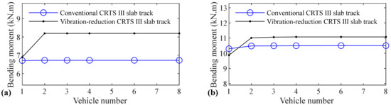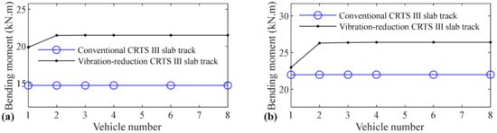 From Figure 9, it can be concluded that vehicle number has a negligible influence on the positive bending moment of rail for the conventional and some influence on the vibration-reduction CRTS III slab tracks, respectively. When the vehicle number increases from one to two, the positive bending moment of the rail increases by 8.1% and 14.4% for the vibration-reduction CRTS III slab tracks without track irregularity and with random track irregularity, respectively. When the vehicle number increases from two to three, the increase is below 0.3%. One vehicle, and two vehicles are, respectively, needed for the conventional and vibration-reduction CRTS III slab tracks to study the positive bending moment of rail.