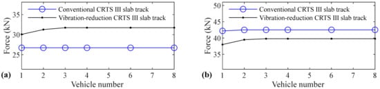 Relation between vehicle number and compressive force of fastener: (a) without and (b) with random track irregularity.