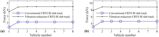 From Figure 11, it can be seen that vehicle number has a negligible influence on the compressive force of fastener for the conventional and a small influence on the vibration-reduction CRTS III slab tracks, respectively. When the vehicle number increases from one to two, the compressive force of the fastener increases by 4.0% and 3.9% for the vibration-reduction CRTS III slab tracks without track irregularity and with random track irregularity, respectively. When the vehicle number increases from two to three, the increase is below 1.6%. Only one vehicle is needed if the simulation precision is not strictly required, and two–three vehicles should be considered if the simulation precision is required to research the compressive force of the fastener.