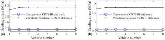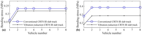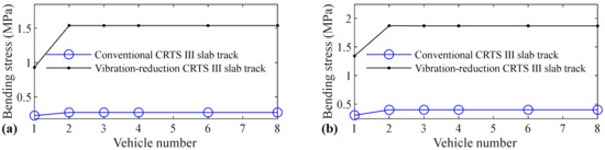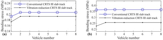 It is clear from Figure 13 that vehicle number has a negligible influence on the positive bending stress of slab for the conventional and some influence on the vibration-reduction CRTS III slab tracks, respectively. When the vehicle number increases from one to two, the positive bending stress of the slab increases by 8.6% and 4.7% for the vibration-reduction CRTS III slab tracks without track irregularity and with random track irregularity, respectively. When the vehicle number increases from two to three, the increase is below 0.7%. One vehicle and two vehicles are, respectively, needed for conventional and vibration-reduction CRTS III slab tracks to research the positive bending stress of the slab.