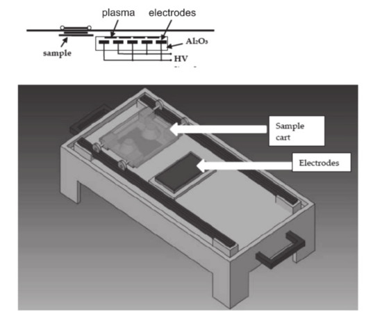 In this work, a diffuse coplanar surface barrier discharge (DCSBD) plasma source (Masaryk University, Brno, Czech Republic) in air under atmospheric pressure was used to modify the surface of the PLA film. The DCSBD plasma source was operated at 300 W. The DCSBD plasma set up is schematically shown in Figure 1.