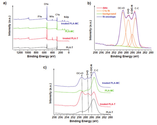 XPS of (a) survey of all samples, (b) C1s deconvolution of treated PLA-T, and (c) C1s region of all samples.