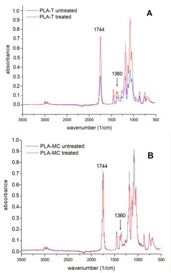 The FTIR spectra shown in Figure 4 confirmed the findings of the XPS experiment, though no new bands occurred. Typical characteristic PLA peaks were present: 2994–2944 cm−1 (C–H), 1744 cm−1 (C=O), 1450 cm−1, and 1360 cm−1 (–CH3), as well as O–C=O stretching at 1185 cm−1 [31,32]. In order to display the changes in the abundancy of carbonyl groups, the relative intensities of the C=O/C–H bands present at 1744 and 1360 cm−1, respectively, were compared. Thus, in the untreated PLA-T spectrum, the 1744/1360 cm−1 ratio was 3.47, while in the treated PLA-T spectrum, the ratio increased to 5.01; this indicated an increase in carbonyl group abundancy associated with a decrease in the number of methyl groups. Unfortunately, the above-mentioned 1744/1360 cm−1 ratios in the PLA-MC film cast from methylene chloride were 4.02 and 4.05 for the untreated and treated samples, respectively. Thus, this finding did not prove the apparent increase in C=O content. However, such discrepancies between XPS and FTIR results have already been reported in the literature, where only few changes in the 1000–1250 cm−1 (C–C/H) and 1750 cm−1 (C=O) regions have been found [21].