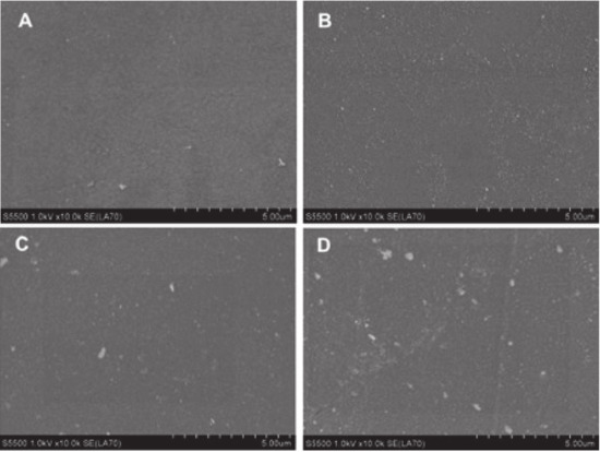 Micrographs were made on a Hitachi s5500 scanning electron microscope (Hitachi High-Technologies Co., Ltd., Tokyo, Japan) at 10,000 × magnification. Images were taken at a voltage of 1 kV without gold sputtering in the LA-BSE (mass contrast) mode.