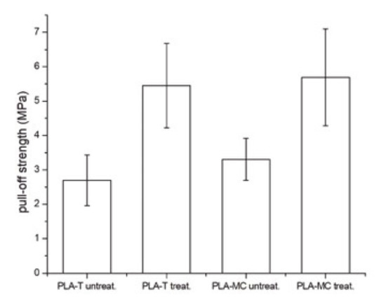 As shown in Table 1, both samples (PLA-T and PLA-MC) had some contamination, such as phosphate (P2p at ~134 eV) and sulphate (S2p at 168 eV), on their surface. The PLA-T sample also showed traces of NaCl (Na1s at ~1071 eV and Cl2p at ~198 eV) and some silanes (Si2p at ~102 eV). PLA-MC showed a high amount of silane (9.0 at. % of Si-O and 48.0 at. % of C-C) contamination, probably resulting from the casting method. As a consequence of this contamination, the plasma treatment was less effective and resulted in lower carbonyl (C=O) and carboxyl (OC=O) contents in the case of treated PLA-MC. In both cases, there was clear increase of C-N (N1s at ~400 eV) coming from the high reactivity of the surface with ambient air. Thus, it seems that hot-pressing is a more reliable method for film-forming and provides higher purity of films.