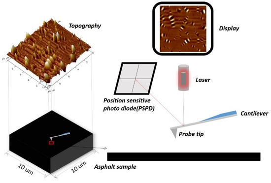 AFM (Bruker Multimode 8, Santa Barbara, CA, USA)was performed to characterize the microstructures of the base and graphene-modified asphalt before and after aging. A schematic diagram of the AFM performed is shown in Figure 1. The four core components used in the AFM were a probe tip, cantilever, laser, and position-sensitive photodiode (PSPD). During scanning, the height variation of the microsurface of the sample will produce a slight force, i.e., an attraction or repulsive force between the probe tip and sample surface. In this case, the cantilever deviates based on “Hooke’s Law,” resulting in a change in the reflection signal of the laser illuminated on the back of the cantilever. The change in the laser reflection signals can be sensed by the PSPD, and the surface topography of the sample can be obtained after treatment [29]. The topography and phase-contrast images were received in the intermittent contact mode, where the elastic constant of the probe was 0.4 N/m, scanning rate was 1.5 Hz, scanning area was 10 μm × 10 μm, and the resolution was 10 nm.