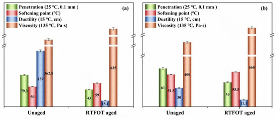 Basic properties of base asphalt (a) and graphene-modified asphalt (b) before and after aging.
