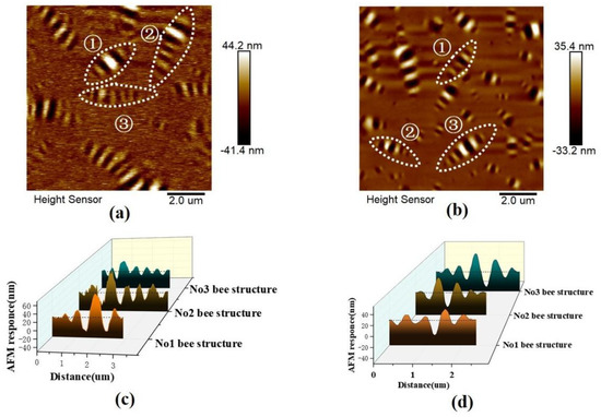 Topographies of asphalt investigated via AFM. (a) 2D image of base asphalt; (b) 2D image of graphene-modified asphalt; (c) topographic profiles of “bee structures” labeled in (a); (d) topographic profiles of “bee structures” labeled in (b).