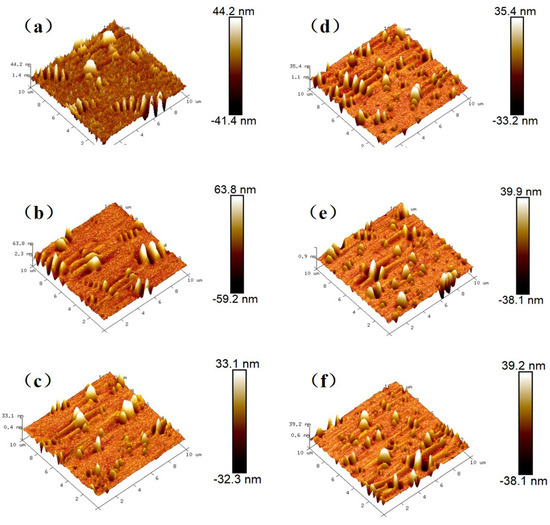 where A is the scanning area, which measured 10 μm × 10 μm in this study; h (x, y) is the height function of the morphology (nm); and h0 is the reference height (nm). The Rq of each sample listed in Table 1 was obtained using “AFM software—Nanoscope Analysis—Roughness,” and was also presented in forms of graphs, as shown in Figure 5.