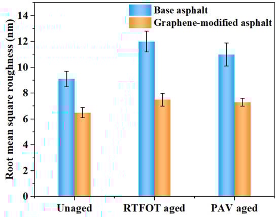 As shown in Figure 5, the Rq of the graphene-modified asphalt was smaller than that of asphalt, indicating that the addition of graphene reduced the roughness of the asphalt surface. The surface roughness is related to the self-healing ability and adhesion performance of asphalt [33]. Briefly, the higher the roughness of the asphalt binder, the better the self-healing ability and adhesion performance of the asphalt. The roughness increased after short-term aging, whether in the base asphalt or graphene-modified asphalt [34,35]. However, the roughness decreased after long-term aging. The different effects of graphene on the AFM morphology and roughness of asphalt after short- and long-term aging were primarily attributed to the decrease in the light components (saturated hydrocarbon and aromatic hydrocarbon) and, correspondingly, the increase in asphaltene and resin contents [36]. In this case, more asphaltenes were attached to the wax chips during the formation of the “bee structure,” resulting in an increase in the “bee structure” volume and the AFM roughness of both the base and graphene-modified asphalt after short-term aging.