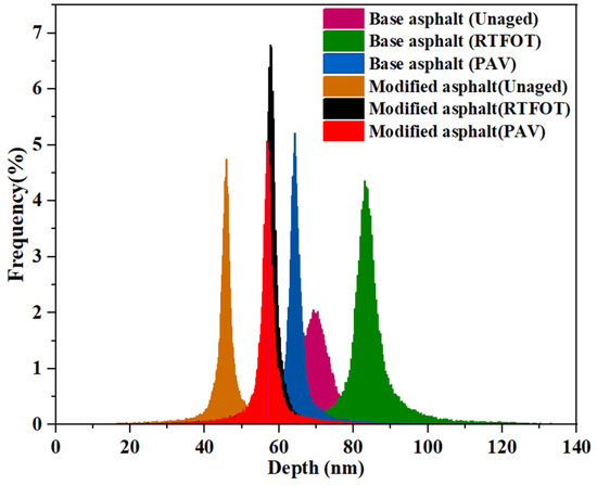 Secondly, the variation in the surface morphology can be quantitatively analyzed by the number of peaks found and peak depth. A group of peaks associate to form a bee structure. The number of bee structures has been previously discussed and here the number of peaks found have not been talked about. A frequency histogram of peak depth distributions is constructed, as presented in Figure 6. As shown, the peak depth distribution histogram of the graphene-modified asphalt under different aging conditions exhibited a smaller peak line than that of the base asphalt, indicating that the number of peaks with greater depth in the graphene-modified asphalt was fewer and the distribution occupied a smaller proportion of the area. The peak heights of the unaged, short-term aged, and long-term aged base asphalt were concentrated in the vicinity of 70, 83, and 62 nm, respectively. The peak heights of the unaged, short-term aged, and long-term aged graphene-modified asphalt were concentrated in the vicinity of 47, 60, and 57 nm, respectively. The addition of graphene might have affected the accumulation of structural components in the “bee structures,” thereby reducing the peak height. The height of the after-aged “bee structure” decreased owing to the change in the asphalt components caused by asphalt aging, the decrease in non-polar components (saturated and aromatic), and the increase in polar features (colloids and asphaltenes).