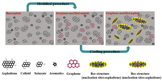 The growth of crystal occurs in the region where the polymerization energy between the crystal and free paraffin is the greatest, resulting in the fastest growth of the sheet structure located on the side of the crystal nucleus. In the other components of the microcrystalline wax and asphalt, asphaltene molecules serve as the core for accumulating crystal clusters and then further develop them into “bee structures.” When the asphalt system is cooled to below the crystallization temperature, the oil in the asphalt on both sides of the peak sheet will ascend along the peak, which can be considered a capillary phenomenon in molten asphalt [39]. Figure 7 shows a schematic diagram of the precipitation of the “bee structures.” In the molten state, asphaltic components (saturates, aromatics, resins, and asphaltenes) are mixed to a homogeneous state. Subsequently, through modification, the graphene modifier is uniformly dispersed in the molten asphalt to form a homogeneous system. During cooling, graphene and asphaltenes will become nucleation sites, and the wax will crystallize easily, thereby resulting in “bee structures.”