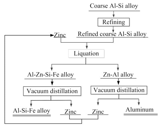 The production of a coarse Al–Si alloy by carbothermal reduction is considered to be one potential method for making use of industrial aluminiferous waste slag [13,14]. It is also considered to be an efficient method of extracting aluminum from low-grade aluminum ore. The underlying principle of the method is the carbothermal reduction of Al2O3 and SiO2 in an arc furnace. A coarse Al–Si alloy containing 35–60 wt% aluminum, 25–60 wt% silicon, and 2–15 wt% iron can be obtained after carbothermal reduction. When the content of iron is higher than 5 wt%, the material is also called a coarse Al–Si–Fe alloy. Coarse Al–Si alloys have several applications, such as deoxidizers for steelmaking and reductants for magnesium smelting, or can be used as materials for extracting aluminum and to produce casting Al–Si alloys [15]. Extracting aluminum from casting Al–Si alloys is considered to be a feasible process for aluminum production. The following methods are used to extract aluminum from coarse Al–Si alloys. The first involves disproportionation reactions of aluminum in the coarse Al–Si alloy or Al–Si–Fe alloy by reaction with AlCl3 or AlF3 to form AlCl or AlF gas at high temperature, which is separated from Si and Fe and reverted to aluminum, AlCl3 or AlF3 at low temperature [16,17]. The second method involves the separation of aluminum by molten salt electrolysis. The aluminum in the coarse Al–Si alloy as a soluble anode is dissolved into the electrolytes and reduced to aluminum at the cathode, whereas Si, Fe, and other impurities remain in the anode alloy in solid form. The third method is selective liquation, which takes advantage of the higher solubility of aluminum compared to iron and silicon in zinc, magnesium or mercury at a given temperature. Aluminum dissolved in zinc, magnesium, or mercury forms a liquid alloy, which separates from Si, Fe, and other impurities that form slag. Of these three methods for extracting aluminum from coarse Al–Si alloys, the third has the lowest energy consumption and highest efficiency.