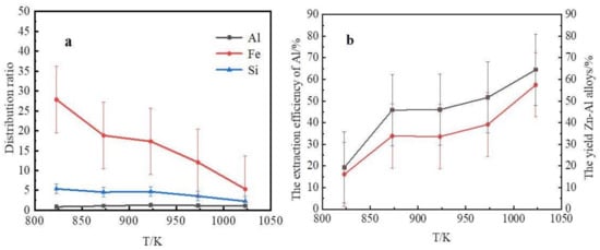 Figure 4a shows the iron and silicon distribution ratio of slag to alloy obtained at different temperatures. This result shows that the contents of iron and silicon in slag were far higher than those in the Zn–Al alloys. After a selective liquation process, a Zn–Al alloy, which contained mainly Zn, Al, and Si, and a slag which contained mainly Zn, Al, Si, Fe, Ti, and Ca were obtained. Hence, most of the silicon and other impurities, such as iron, titanium, and calcium, in the coarse Al–Si alloy were separated from the aluminum by the selective liquation process. The iron and silicon distribution ratio of slag to alloy decreased as the liquation temperature was increased. Thus, an Al–Si alloy rather than pure aluminum was obtained after zinc was removed by vacuum distillation. According to Equation (1), the extraction efficiencies of aluminum and the yield of Zn–Al alloys at various liquation temperatures are shown in Figure 4b. This result shows that the extraction efficiency of aluminum and the yield of Zn–Al alloys increased as the liquation temperature was increased. When the zinc of the Zn–Al alloy and slag was distilled out, Al–Si alloys and Al–Si–Fe alloys were obtained. The contents of Si, Fe, and Al in the Al–Si alloys are plotted in Figure 5.