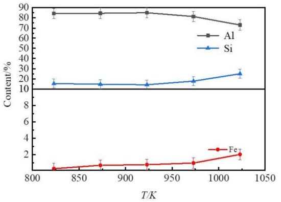 As shown in Figure 5, the content of silicon and iron in Al–Si alloys increased. The contents of Al, Si, and Fe in the Al–Si alloys were 73–85 wt%, 15–25 wt% and 0.30–2.00 wt%, respectively. When the temperature was below 873 K, the content of Fe in the products obtained by the distillation of Zn–Al alloys was lower than 0.70 wt%. The contents of other impurities conformed with the quality standards of the casting Al–Si alloys. When the liquation temperature was greater than 873 K, the content of Fe surpassed the ratified content (0.7 wt%).