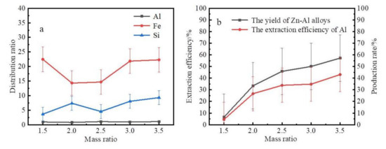 The influence of the mass ratio of zinc to coarse Al–Si alloy. (a) Effect of mass ratio on the extraction rate and yield. (b) The element distribution ratio of slag to alloy.