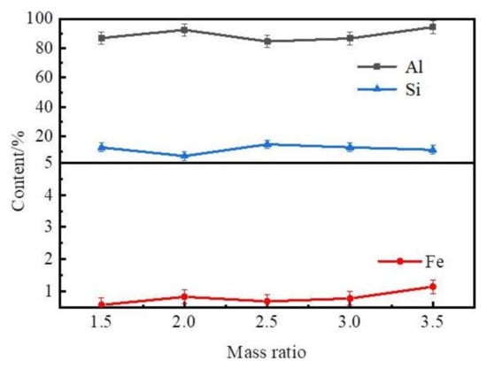 Figure 6a shows that the iron and silicon distribution ratio of slag to alloy was high at different mass ratios of zinc to coarse Al–Si alloy. As shown in Figure 6b, the extraction efficiency of aluminum and the yield of the Zn–Al alloys increased as the mass ratio of zinc to coarse Al–Si alloy was increased. The content of Al and Si in the Zn–Al alloys decreased as the mass ratio of zinc to coarse Al–Si alloy was increased. The contents of Si, Fe, and Al in the Al–Si alloys were distilled out and are plotted in Figure 7.