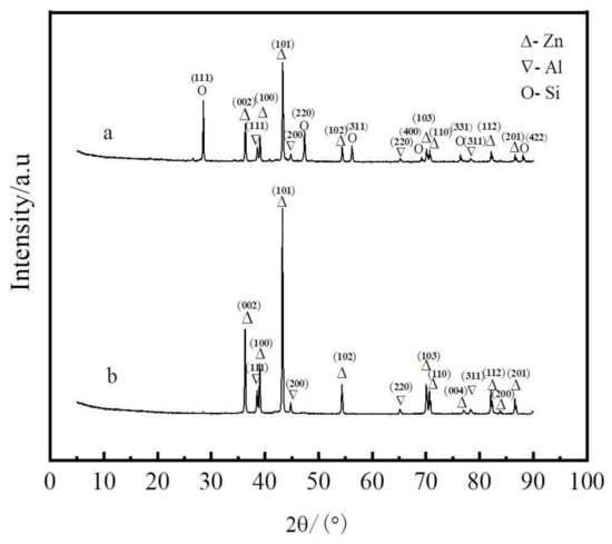 Figure 8 shows XRD patterns of the Zn–Al alloy and slag at a liquation temperature of 873 K and 2.5 mass ratio of zinc to coarse Al–Si alloy.