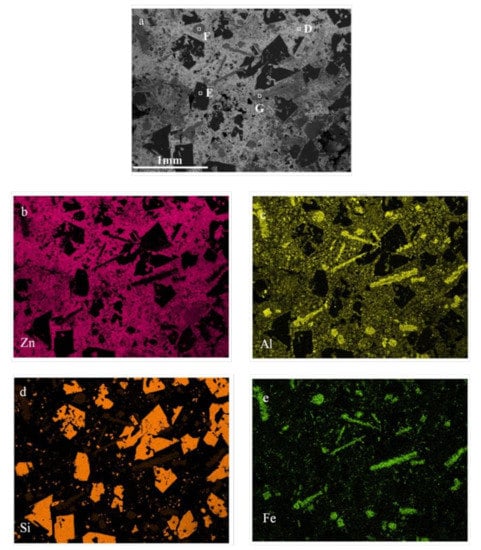 The SEM, elemental distribution and EDS analyses indicate that the slag is a kind of Zn–Al–Si–Fe alloy and mainly consists of a η-solid solution (e.g., point D consists of 98.74% Zn and 1.26% Al), pure silicon grains (e.g., point E consists of 100% Si), and Al–Si–Fe intermetallics. Most of the silicon is in the form of large pure silicon grains and some is in the form of Al–Si–Fe intermetallics. The iron-rich phase is an all Al–Si–Fe intermetallic, which is granular (e.g., point F and consists of 39.91% Al, 33.03% Si, 25.16% Fe, and 1.9% Zn) and a long strip (e.g., point G consists of 23.31% Al, 39.87% Si, 32.46% Fe, and 4.19% Zn).