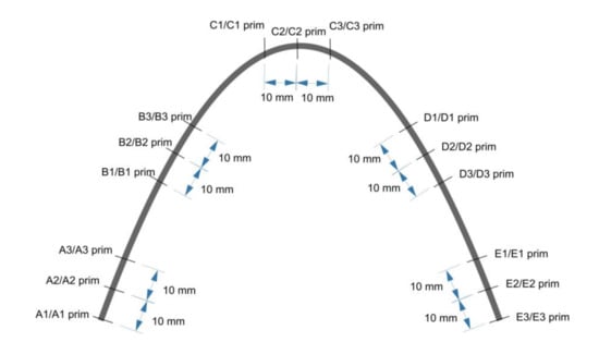 For each wire type, one wire was randomly selected from three randomly selected packages. Each wire was tested at 15 points on the wider surface of the wire, marked A1, A2, A3, B1, B2, B3, C1, C2, C3, D1, D2, D3, E1, E2, E3: A1‘, A2‘, A3‘, B1‘, B2‘, B3‘, C1‘, C2‘, C3‘, D1‘, D2‘, D3‘, E1‘, E2‘, E3‘ (Figure 1). Prim points are located on the second side of the wire.