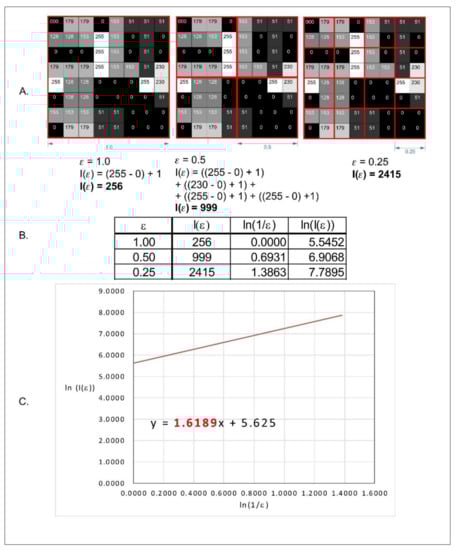Graphical interpretation of intensity difference algorithm of fractal dimension counting. (A) Grayscale 8 bits analyzed image, numbers in squares represent intensity level of each pixel, 0 is black, 255 is white. Red squares represent scale—ε. (B) Values of intensity difference for each step of scale reduction (ε = 1.0, ε = 0.5, ε = 0.25). (C) Straight line drawn through points from table B on the x–y chart in natural logarithm scale. Slope factor of this straight line is a value fractal dimension calculated by the intense difference algorithm.